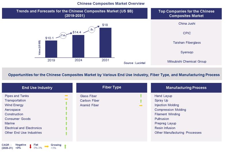 According to a market report by Lucintel, the future of the global Chinese composite market looks promising with opportunities in transportation, marine, wind energy, aerospace, pipes and tanks, construction, electrical and electronics, and consumer goods in end use. The global Chinese composite market is expected to reach an estimated $18.0 billion by 2031 from $14.4 billion in 2024, at a CAGR of 3.0% from 2023 to 2030. The major drivers for this market are increasing demand for composites in the transportation industry, growth in building and construction industry and growth in new installation of wind turbines will boost the demand for composite materials.Browse 64 figures / charts and 60 tables in this 175 -page report to understand trends, opportunity and forecast in Chinese composite market to 2031 by end use (transportation, marine, wind energy, aerospace, pipes and tanks, construction, electrical and electronics, consumer goods, and others), manufacturing process (hand lay up, spray up, resin infusion, pultrusion, injection molding, compression molding, filament winding, prepreg layup, and other manufacturing process), and fiber type (glass fiber, carbon fiber, and aramid fiber).