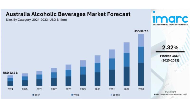 According to IMARC Group's latest research publication, "Australia Alcoholic Beverages Market: Industry Trends, Share, Size, Growth, Opportunity and Forecast 2025-2033", The Australia alcoholic beverages market size was valued at USD 32.3 Billion in 2024. Looking forward, IMARC Group estimates the market to reach USD 39.7 Billion by 2033, exhibiting a growth rate of 2.32% during 2025-2033.