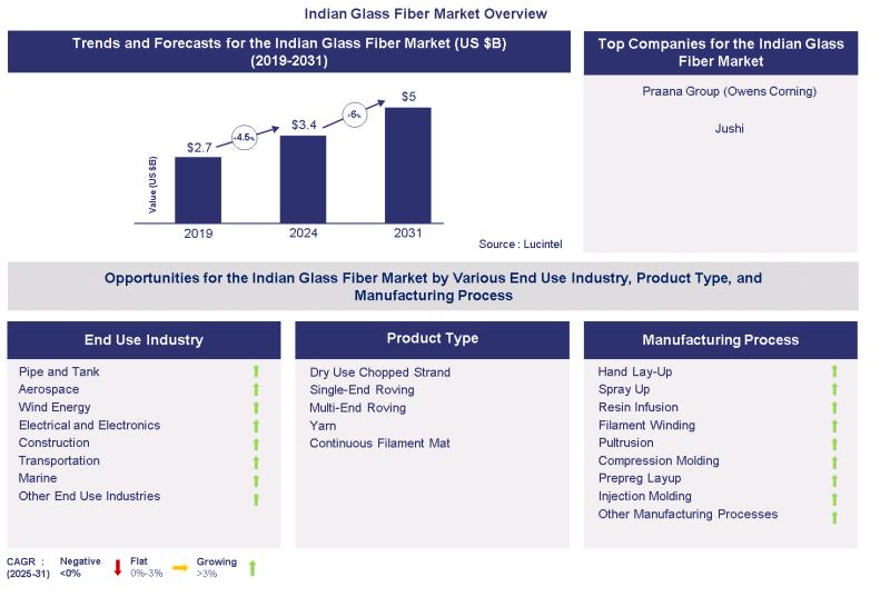 According to the recent study the Indian composites market is projected to reach an estimated $3 billion by 2031 from $2.2 billion in 2024, at a CAGR of 5% from 2024 to 2031. Growth in this market is primarily driven by increasing demand for lightweight materials in the aerospace & defense and automotive industries; corrosion and chemical-resistant materials' demand in the construction and pipe & tank industries; demand for materials with electrical resistance and high flame retardancy in the electrical and electronics industry.Browse 107 figures / charts and 68 tables in this 205 -page report to understand trends, opportunities and forecast in Indian composites market by nd use (pipe & tank, transportation, wind energy, aerospace and defense, construction, marine, and electrical and electronics, and others), fiber type (glass fiber based composites, carbon fiber based composites, and aramid fiber based composites), and resin type (UPR based composites, epoxy based composites, vinyl Ester based composites, and others).