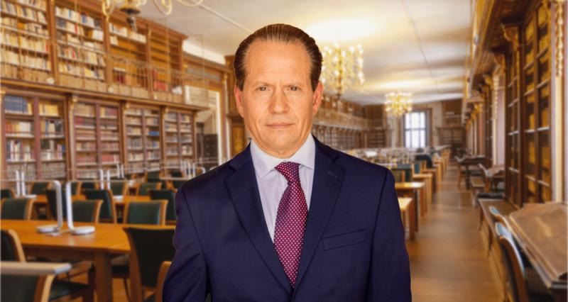 A professional portrait of Jack G. Bernstein, a personal injury lawyer, standing in a grand library with tall bookshelves.