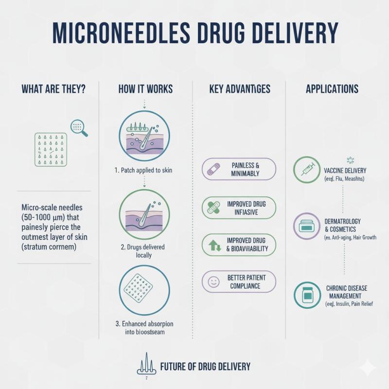 The Microneedles Drug Delivery Market involves the development and commercialization of minimally invasive devices designed to deliver drugs through the skin painlessly. These systems enhance drug bioavailability, improve patient compliance, and reduce side effects. Widely applied in vaccines, insulin, and cosmetic treatments, the market is driven by technological advancements, rising chronic diseases, and demand for targeted, efficient, and patient-friendly drug delivery solutions.