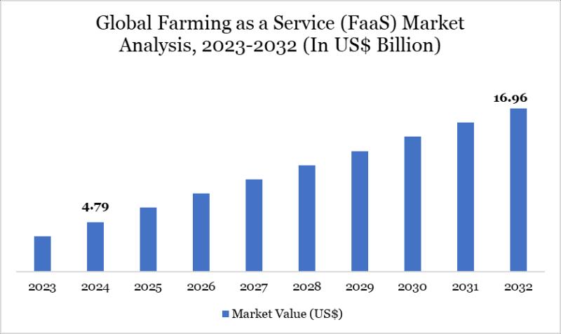 Farming as a service (FaaS) market size reached US$ 4.79 billion in 2024 and is expected to reach US$ 16.96 billion by 2032, growing with a CAGR of 17.12% during the forecast period 2025-2032.DataM Intelligence has published a new research report on "Farming as a Service Market Size 2025". The report explores comprehensive and insightful Information about various key factors like Regional Growth, Segmentation, CAGR, Business Revenue Status of Top Key Players and Drivers. The purpose of this report is to provide a telescopic view of the current market size by value and volume, opportunities, and development status.