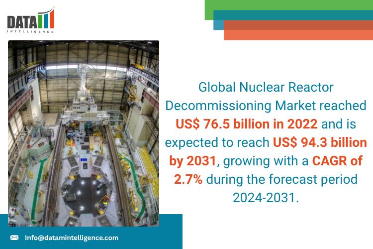 Global Nuclear Reactor Decommissioning Market reached US$ 76.5 billion in 2022 and is expected to reach US$ 94.3 billion by 2031, growing with a CAGR of 2.7% during the forecast period 2024-2031.