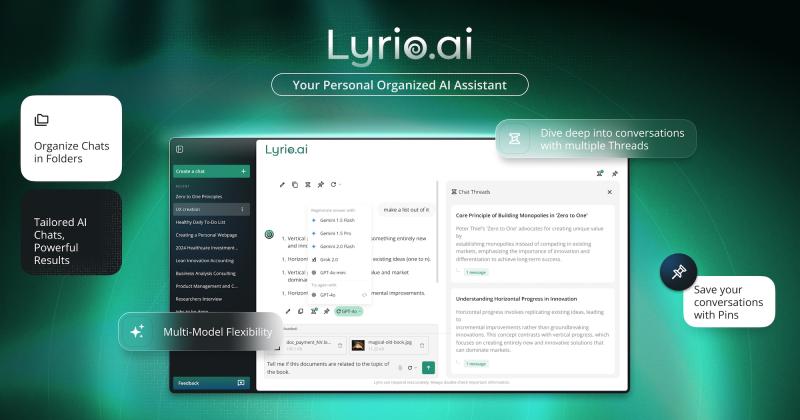 Lyrio, a next-generation AI chat platform, today launched with its groundbreaking "Threads" feature, designed to bring unprecedented order and efficiency to AI conversations.Lyrio addresses a critical challenge: as AI responses grow more complex, users struggle to explore specific topics without losing context. The platform's Thread system allows users to branch multiple focused conversations from a single AI response, either from auto-detected subtopics or manually selected text.