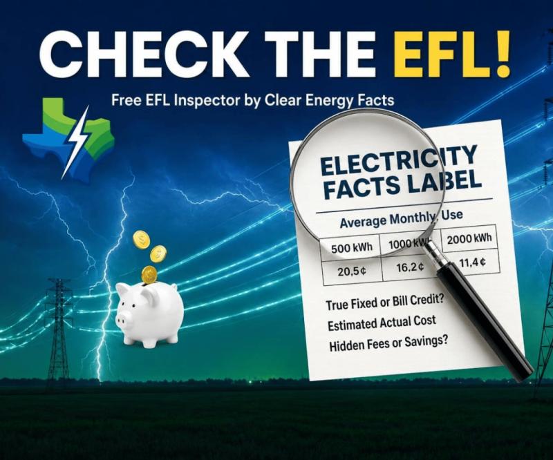 Clear Energy Facts has launched its free EFL Inspector, a tool designed to help Texas electricity shoppers analyze Electricity Facts Labels, compare plans against cheaper market alternatives, estimate potential overpayment, and identify pricing gimmicks such as bill-credit plans before choosing an electricity provider.