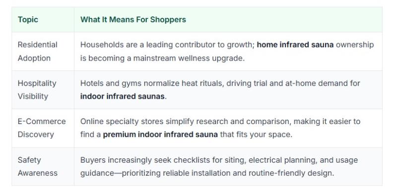 The category's growth is not just a niche trend; it reflects the widening appeal of home wellness amenities, with hospitality, fitness, and residential upgrades reinforcing each other. The cited analysis specifically details the U.S. market's product mix and end-user segments, which helps consumers see how commercial adoption spills over into at-home infrared sauna demand.