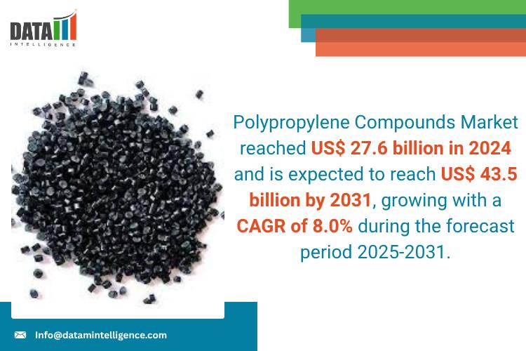 Polypropylene Compounds Market reached US$ 27.6 billion in 2024 and is expected to reach US$ 43.5 billion by 2031, growing with a CAGR of 8.0% during the forecast period 2025-2031.