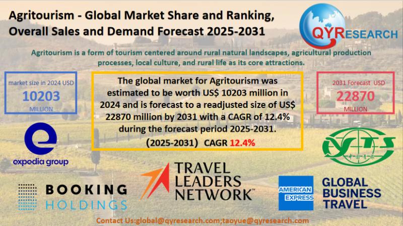 The global market for Agritourism was estimated to be worth US$ 10203 million in 2024 and is forecast to a readjusted size of US$ 22870 million by 2031 with a CAGR of 12.4% during the forecast period 2025-2031.Global Leading Market Research Publisher QYResearch announces the release of its latest report "Agritourism - Global Market Share and Ranking, Overall Sales and Demand Forecast 2025-2031". Based on current situation and impact historical analysis (2020-2024) and forecast calculations (2025-2031), this report provides a comprehensive analysis of the global Agritourism market, including market size, share, demand, industry development status, and forecasts for the next few years.