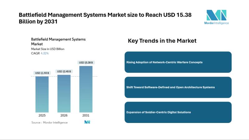According to Mordor Intelligence, the battlefield management systems market size was valued at USD 12.45 billion in 2026 to reach USD 15.38 billion by 2031. This growth reflects sustained investments in digital command platforms that support joint and multi-domain operations.