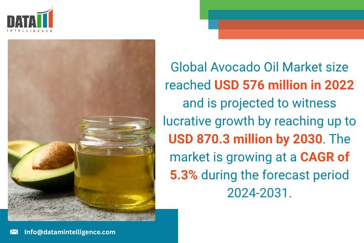 Global Avocado Oil Market size reached USD 576 million in 2022 and is projected to witness lucrative growth by reaching up to USD 870.3 million by 2030. The market is growing at a CAGR of 5.3% during the forecast period 2024-2031.