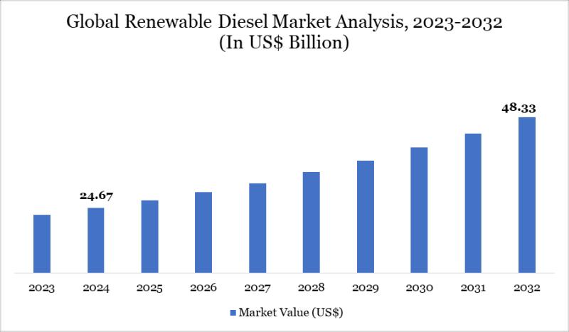 As per DataM intelligence research report "Renewable Diesel Market size reached US$ 24.67 billion in 2024 and is expected to reach US$ 48.33 billion by 2032, growing with a CAGR of 8.77% during the forecast period 2025-2032."