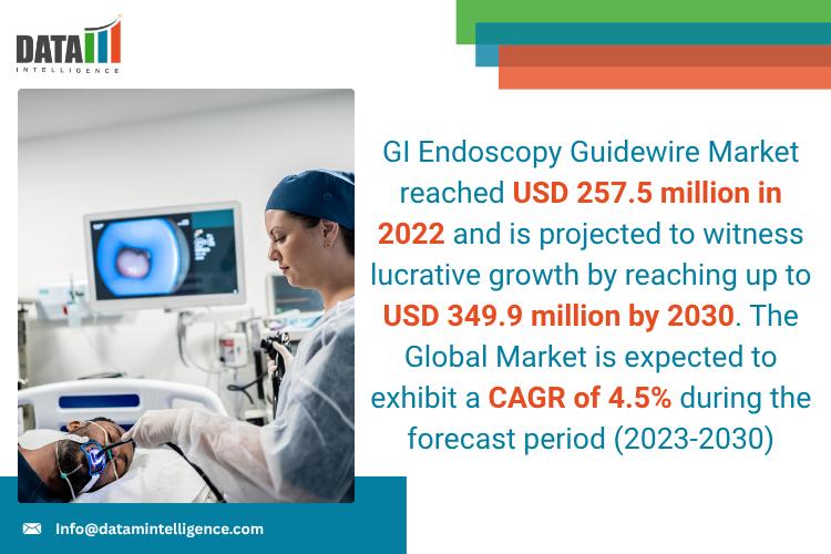 GI Endoscopy Guidewire Market reached USD 257.5 million in 2022 and is projected to witness lucrative growth by reaching up to USD 349.9 million by 2030. The Global Market is expected to exhibit a CAGR of 4.5% during the forecast period (2023-2030)