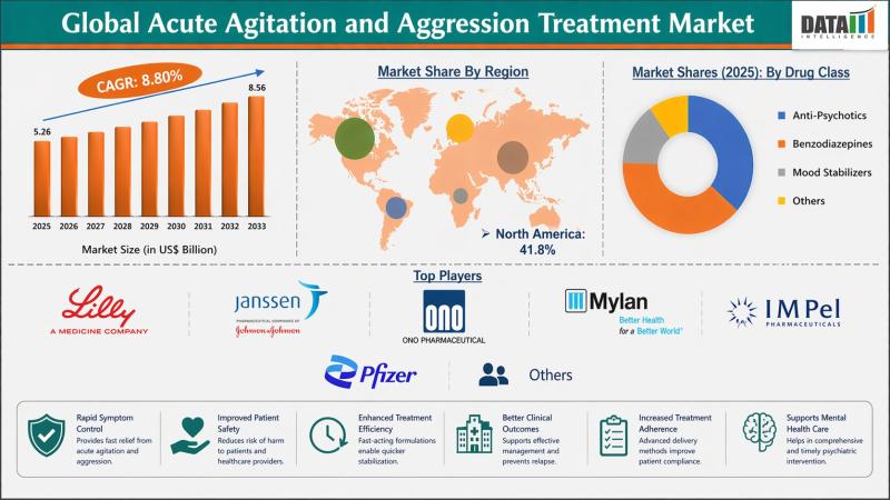 The global acute agitation and aggression treatment market was valued at USD 5.26 billion in 2025 and is estimated to reach USD 8.56 billion by 2033, growing at a CAGR of 8.8% during the forecast period from 2026 to 2033. The market is witnessing steady growth driven by the increasing prevalence of psychiatric disorders and the rising need for rapid and effective management of acute behavioral episodes.