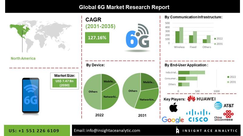 InsightAce Analytic Pvt. Ltd. announces the release of a market assessment report on the "Global 6G Market Size, Share & Trends Analysis Report By Devices (Mobile Devices, IoT and Edge-Computing Devices, Networking Devices), Communication Infrastructure (Wireless And Fixed) And End Users (Consumer Applications And Industrial And Enterprise)- Market Outlook And Industry Analysis 2035"The global 6G market is estimated to reach over USD 159.54 billion by 2035, exhibiting a CAGR of 127.16% during the forecast period.