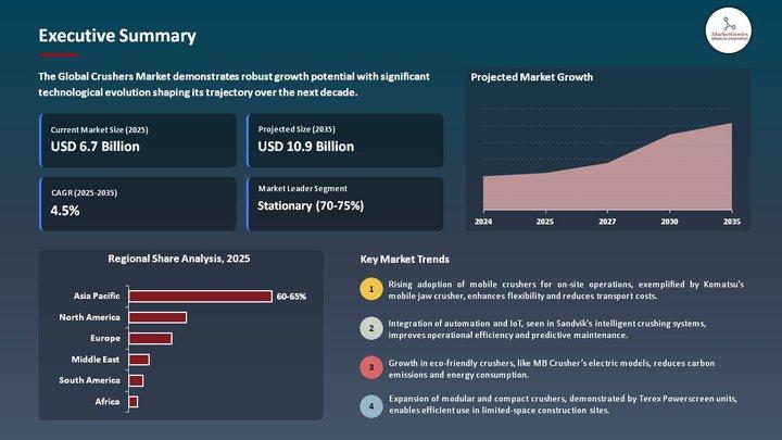 According to the report, the global crushers market is likely to grow from USD 6.7 Billion in 2025 to USD 11.9 Billion in 2035 at a highest CAGR of 4.5% during the time period. The crushers market globally is experiencing massive growth and all these developments have been triggered by a number of factors. Among them is the rising demand of construction materials that is rising up due to urbanization…
