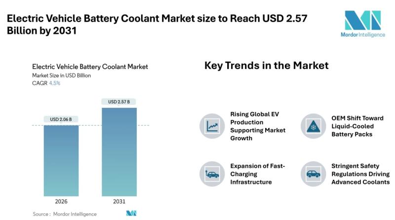 According to Mordor Intelligence, the electric vehicle battery coolant market size [https://www.mordorintelligence.com/industry-reports/electric-vehicle-battery-coolant-market?utm_source=abnewswire] was valued at USD 2.06 billion in 2026 and is projected to reach USD 2.57 billion by 2031, registering a CAGR of 4.50% during the forecast period. The electric vehicle battery coolant market…