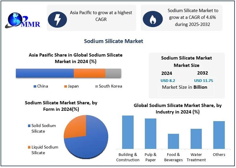 Sodium Silicate Market size was valued at USD 8.2 Bn. in 2024 and the total Global Sodium Silicate Market revenue is expected to grow at a CAGR of 4.6% from 2025 to 2032, reaching nearly USD 11.75 Bn. by 2032.