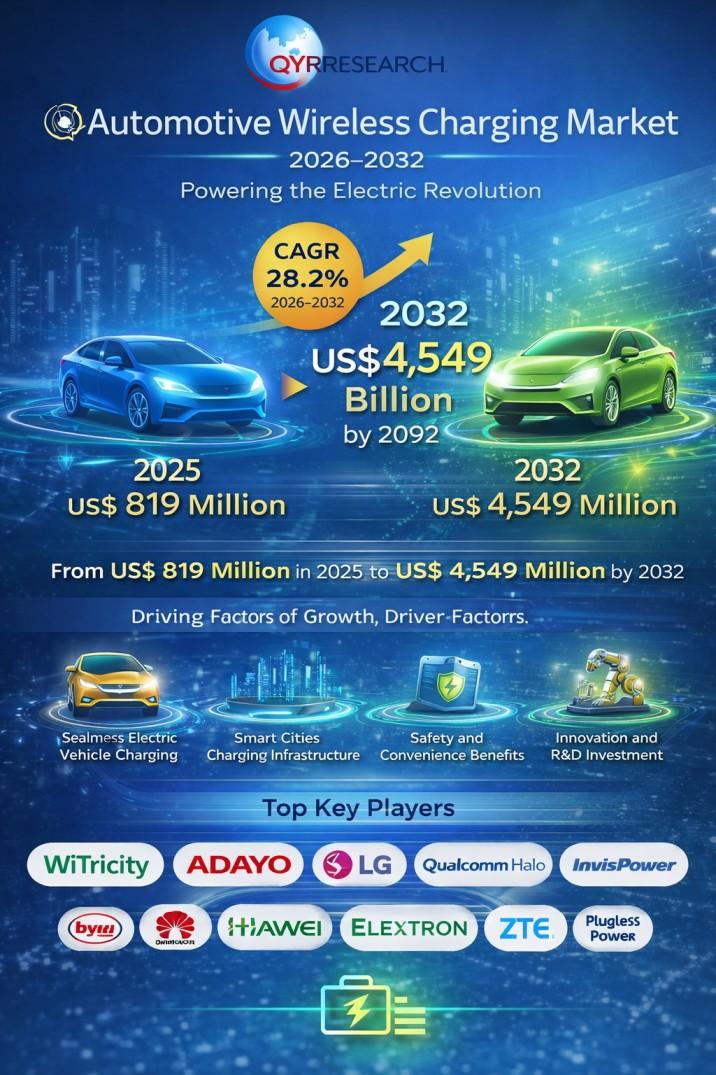 QY Research Inc., A global market research and consulting firm, has announced the release of its latest 2026 report titled "Automotive Wireless Charging - Global Market Share and Ranking, Overall Sales and Demand Forecast 2026-2032." The report provides a data-driven analysis of the global Automotive Wireless Charging market, integrating historical insights from 2020-2025 with forward-looking forecasts through 2032. It covers market size, competitive landscape, demand…