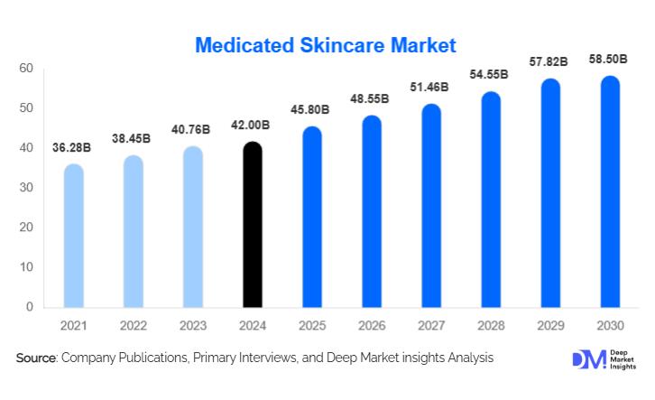Medicated skincare, once a niche segment, has evolved into a mainstream solution for consumers seeking to address skin conditions such as acne, eczema, psoriasis, and rosacea. With increasing awareness about skin health and the desire for targeted treatments, the market for medicated skincare products is experiencing robust growth.According to Deep Market Insights, the medicated skincare market is expected to grow from USD 42.0 billion in 2024 to USD 58.5 billion by 2030, with a CAGR of 6.0%. The growth is driven by the increasing prevalence of skin conditions, the growing demand for personalized skincare solutions, and the rising awareness of the benefits of medicated products for skin health.