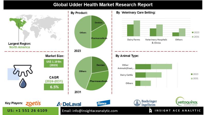 InsightAce Analytic Pvt. Ltd. announces the release of a market assessment report on the "Global Udder Health Market - (by Product (Pharmaceuticals (Antibiotics, Intramammary Infusions), Devices (Milk Quality Analysers), Supplements)), Veterinary Care Settings (Dairy Farms, Veterinary Hospitals & Clinics)), Trends, Industry Competition Analysis, Revenue and Forecast To 2031."