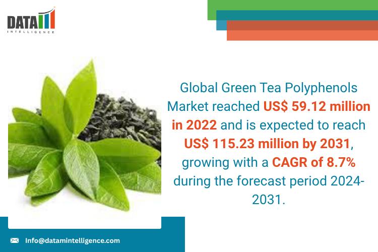 Global Green Tea Polyphenols Market reached US$ 59.12 million in 2022 and is expected to reach US$ 115.23 million by 2031, growing with a CAGR of 8.7% during the forecast period 2024-2031.