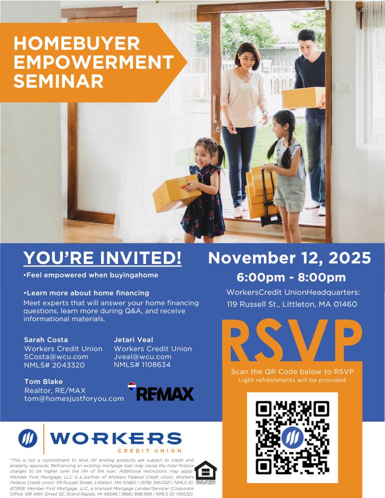 Central MA - November 2025 - Central Massachusetts homebuyers are invited to a free Homebuyer Empowerment Seminar hosted by Thomas G. Blake, REALTOR® of RE/MAX Liberty, in partnership with Workers Credit Union's Sarah Costa and Jetari Veal.The seminar will take place on Wednesday, November 12, 2025, from 6:00 p.m. to 8:00 p.m. at Workers Credit Union Headquarters, 119 Russell Street, Littleton, MA. Light refreshments will be served.