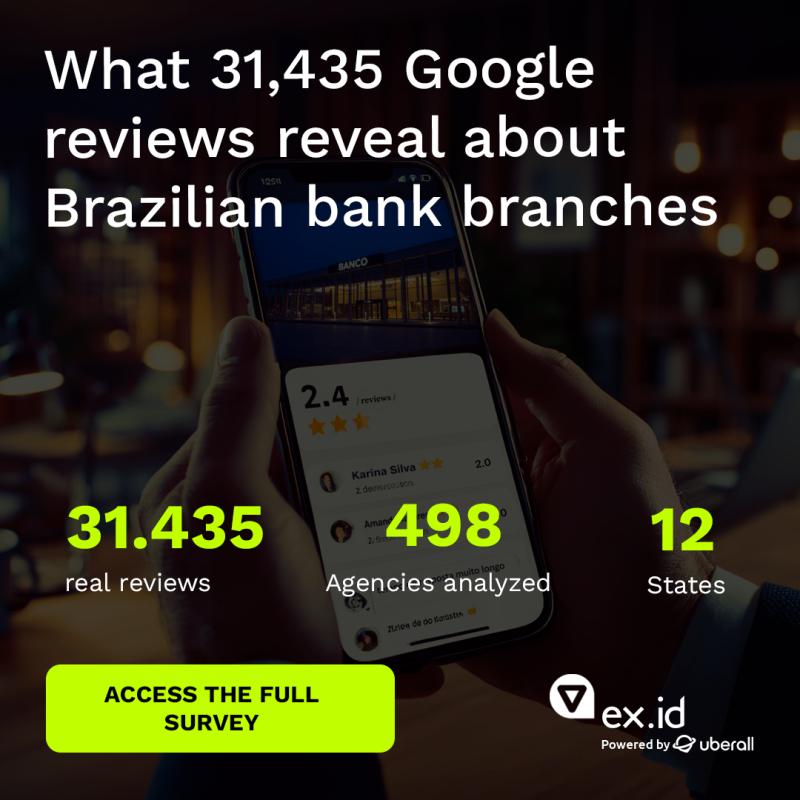 Ex.id and Uberall reveal digital reputation crisis in Brazilian banking: study analyzed 31,435 Google reviews from 498 branches of Itaú, Bradesco, Banco do Brasil, Santander, and Cx Economica Federal across 12 states.Critical findings: Two banks have ≥60% of branches below 3.0 stars; response time 3x slower than fintechs (3-7 days vs 24-48h), with each delay day reducing visit intention by 8%; regional disparity of up to 1.2 stars between North/Northeast and South/Southeast.