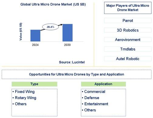 According to a market report by Lucintel, the future of the global ultra micro drone market looks promising with opportunities in the commercial, defense, and entertainment markets. The global ultra micro drone market is expected to grow with a CAGR of 20.4% from 2024 to 2030. The major drivers for this market are the growing demand among consumers for portable and affordable drones, technological advancements in miniaturization, battery efficiency, and sensor technology, and growth in indoor flying environments and applications.A more than 150-page report to understand trends, opportunity and forecast in ultra micro drone market to 2030 by type (fixed wing, rotary wing, and others), application (commercial, defense, entertainment, and others), and region (North America, Europe, Asia Pacific, and the Rest of the World).