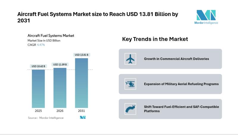 According to Mordor Intelligence, the aircraft fuel systems market was valued at USD 11.09 billion in 2026 and is expected to reach USD 13.81 billion by 2031, reflecting steady aircraft fuel systems market growth during the forecast period. Rising aircraft production, expanding military refuelling programs, and upgrades to digital fuel management technologies are shaping the aircraft fuel systems market forecast.