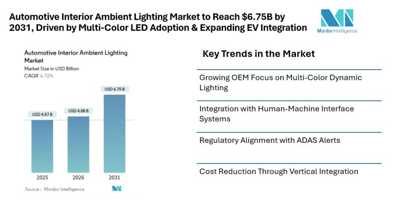 According to Mordor Intelligence, the automotive interior ambient lighting market size is estimated at USD 4.88 billion in 2026, growing from USD 4.57 billion in 2025, and is projected to reach USD 6.75 billion by 2031, registering a 6.72%…