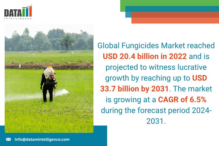 Global Fungicides Market reached USD 20.4 billion in 2022 and is projected to witness lucrative growth by reaching up to USD 33.7 billion by 2031. The market is growing at a CAGR of 6.5 % during the forecast period 2024-2031.