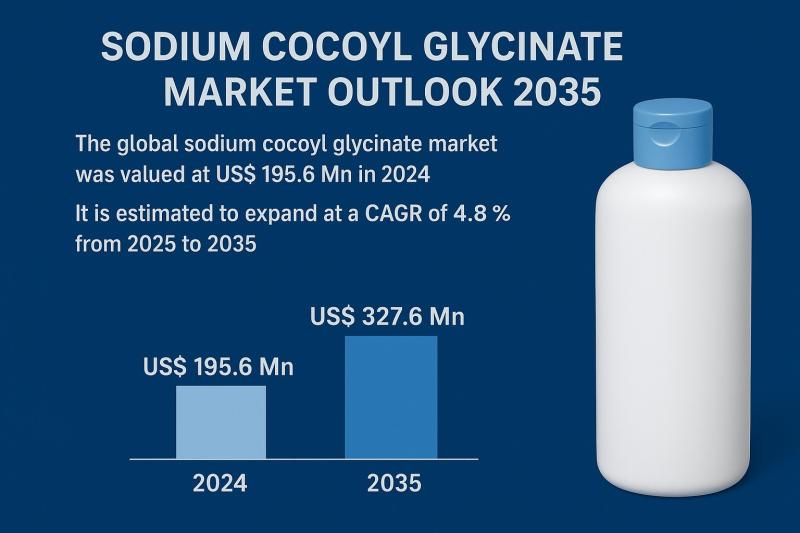 Sodium Cocoyl Glycinate Market Outlook 2035The global sodium cocoyl glycinate market was valued at US$ 195.6 Mn in 2024 and is set for steady expansion over the next decade. Rising preference for natural, mild, and skin-friendly surfactants in high-end personal care products is accelerating demand. The market is projected to grow at a CAGR of 4.8% from 2025 to 2035 and reach US$ 327.6 Mn by 2035. Increasing popularity of sulfate-free skincare and haircare, clean-beauty trends, and growing consumer awareness regarding ingredient transparency are key drivers shaping market growth.