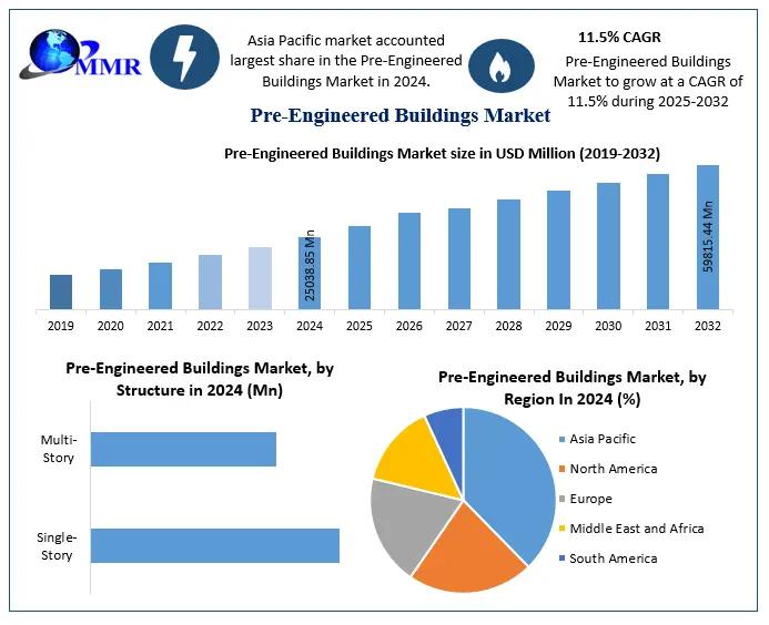The Pre-Engineered Buildings (PEB) Market is witnessing a significant transformation, driven by rapid industrialization, infrastructure expansion, and the growing adoption of off-site construction technologies. According to recent market analysis, the Pre-Engineered Buildings Market was valued at USD 25,038.85 million in 2024 and is projected to reach USD 59,815.44 million by 2032, growing at a strong CAGR of 11.5% during the forecast period (2025-2032).