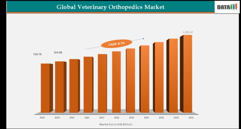 As per DataM intelligence research report "The global veterinary orthopedics market size reached US$ 519.78 million in 2023, with a rise to US$ 564.98 million in 2024, and is expected to reach US$ 1,202.47 million by 2033, growing at a CAGR of 8.7% during the forecast period 2025-2033."