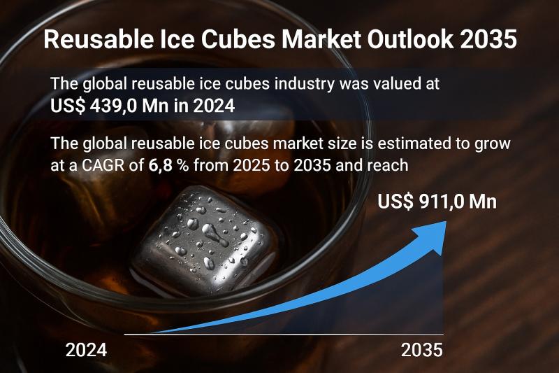 According to a new market study, "Reusable Ice Cubes Market (Material: Stainless Steel, Stones, Plastic, Silica Gel Based, and Others; Application: Household Use and Commercial Use) - Global Industry Analysis, Size, Share, Growth, Trends, and Forecast, 2025-2035", the global reusable ice cubes market is projected to expand at a CAGR of 6.8%, rising from US$ 439.0 million in 2024 to US$ 911.0 million by 2035.