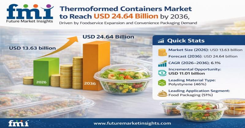 The global thermoformed containers market is witnessing steady expansion as industries increasingly rely on lightweight, durable, and visually appealing packaging solutions. According to the latest analysis, the market is valued at USD 13.63 billion in 2026 and is projected to reach USD 24.64 billion by 2036, expanding at a CAGR of 6.1%. The sector is expected to generate an incremental opportunity of USD 11.01 billion over the forecast period.
