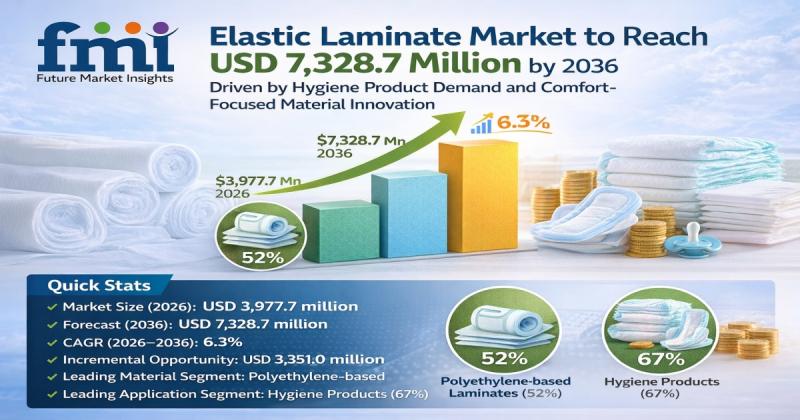 The global elastic laminate market is entering a steady growth phase as demand accelerates across hygiene, medical, and personal care applications. According to the latest analysis, the market is valued at USD 3,977.7 million in 2026 and is projected to reach USD 7,328.7 million by 2036, expanding at a CAGR of 6.3%. The sector is expected to generate an incremental opportunity of USD 3,351.0 million over the forecast period.
