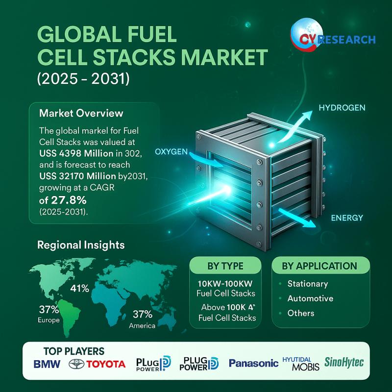 Los Angeles, United States - QY Research has unveiled its latest study titled "Global Fuel Cell Stacks Market Share and Ranking, Overall Sales and Demand Forecast 2025-2031." This newly released report delivers a comprehensive overview of the global Fuel Cell Stacks market, analyzing the forces shaping its growth trajectory and providing valuable insights for stakeholders, investors, and industry professionals. the research covers key areas including market dynamics, segmentation, regional performance, competitive landscape, and emerging technology trends that are redefining industry standards. Backed by reliable data and expert analysis, the report serves as a trusted guide to understanding both microeconomic and macroeconomic factors driving market evolution.The global market for Fuel Cell Stacks was estimated to be worth US$ 6388 million in 2024 and is forecast to a readjusted size of US$ 32110 million by 2031 with a CAGR of 27.8% during the forecast period 2025-2031.