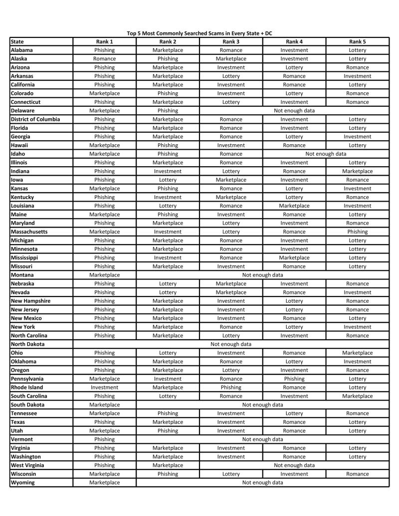 Finally, the fifth most commonly searched fraud in America is the lottery fraud. The catch is you have to pay a fee to unlock the prize or inheritance, which of course never exists. While searched over 510 times monthly nationally, these frauds appear to be decreasing in frequency as public awareness grows.