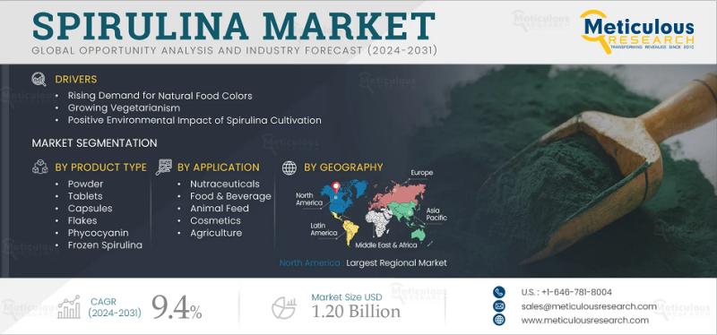 The global spirulina market is gaining significant momentum, driven by increasing health consciousness, growing demand for natural food ingredients industry. Valued at $0.59 billion in 2023, the market is projected to reach $1.20 billion by 2031, growing at a CAGR of 9.4% from 2024 to 2031. Spirulina, a nutrient-dense blue-green microalga, has found applications across diverse industries-from nutraceuticals and food & beverages to cosmetics and biofuels-owing to its superior nutritional profile and environmental benefits.Download Sample Report Here : https://www.meticulousresearch.com/download-sample-report/cp_id=5070