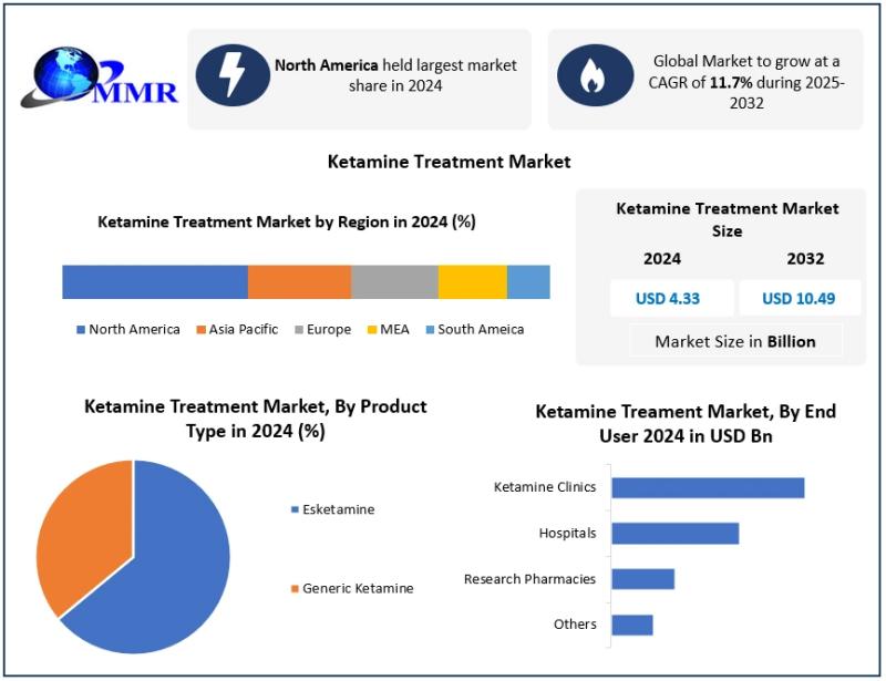 The Ketamine Treatment Market was valued at USD 4.33 Bn in 2024, and total global Ketamine Treatment Market revenue is expected to grow at a CAGR of 11.7% & reaching nearly USD 10.49 Bn from 2025-2032
