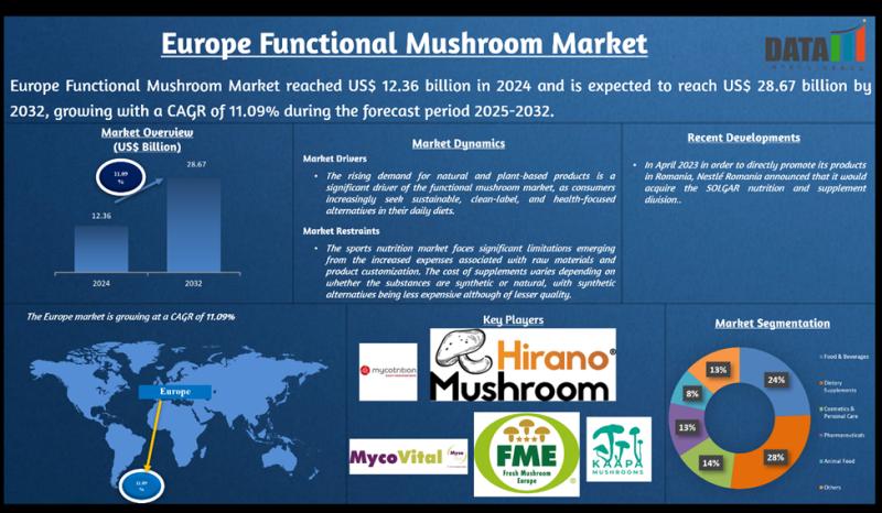 The Europe functional mushroom market reached USD 12.36 billion in 2024 and is expected to reach USD 28.67 billion by 2032, growing at a CAGR of 11.09% during the forecast period 2025-2032, according to DataM Intelligence.