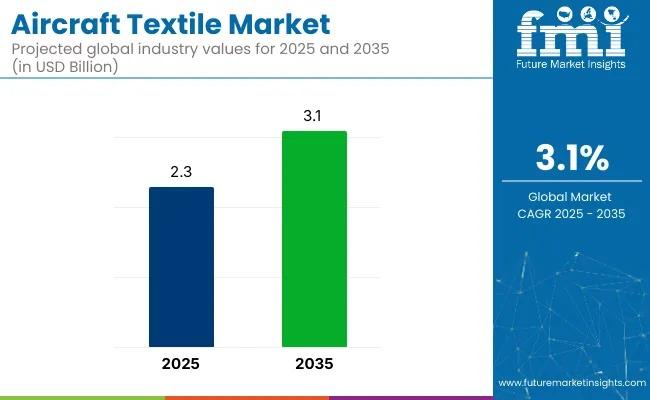 The global Aircraft Textile Market is gearing up for a decade of steady growth, expected to rise from USD 2.3 billion in 2025 to USD 3.1 billion by 2035, registering a compound annual growth rate (CAGR) of 3.1%. This momentum is being powered by evolving cabin design trends, surging air travel demand, and a renewed focus on passenger comfort and sustainability.