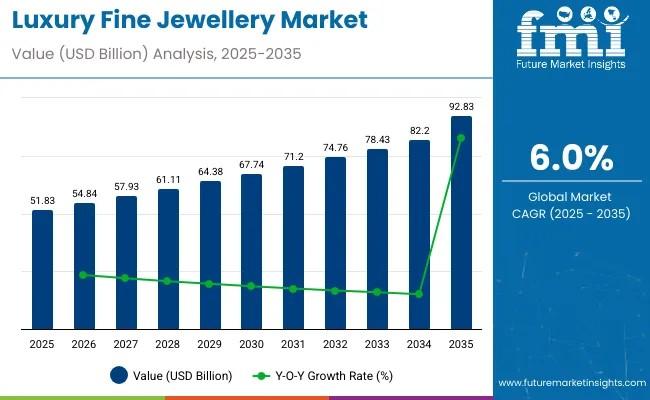 The luxury fine jewellery market is poised for a transformative decade, with an anticipated steady growth trend driven by evolving consumer preferences, cutting-edge technology, and a rising focus on sustainability. According to the latest market analysis, the global luxury fine jewellery market is projected to expand from USD 51.83 billion in 2025 to USD 92.83 billion by 2035, reflecting a compound annual growth rate (CAGR) of 6.0%.