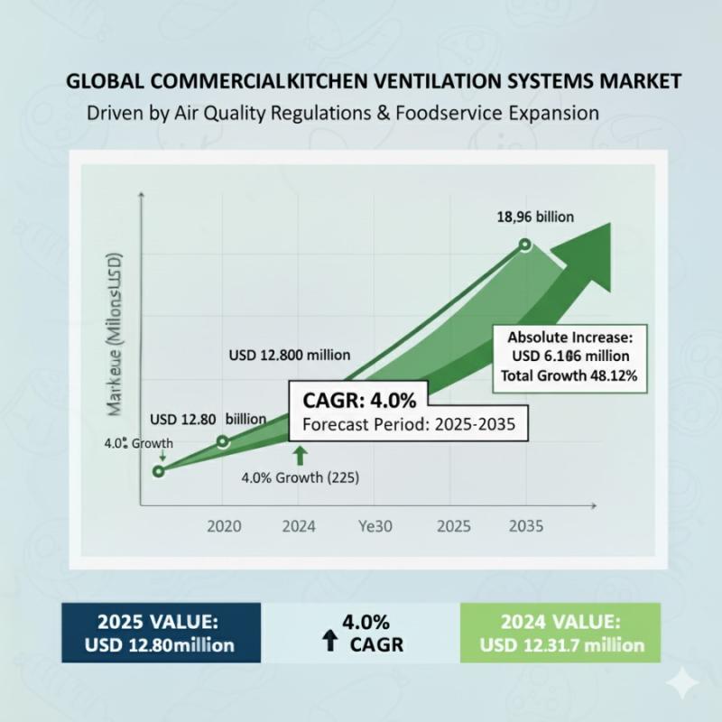 Future Market Insights (FMI), a leading provider of market intelligence and consulting services, today announced the publication of its latest in-depth report, "Commercial Kitchen Ventilation System Market Outlook 2025 to 2035." This comprehensive analysis forecasts steady global market expansion, driven by escalating demands for indoor air quality, regulatory compliance, and sustainable foodservice operations. Valued at USD 12.80 billion in 2025, the market is projected to reach USD 18.96 billion by…