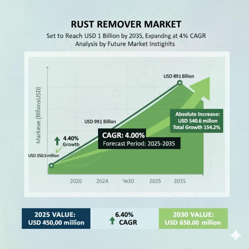 The global rust remover market is poised for consistent expansion over the next decade, fueled by industrial growth, infrastructure maintenance, and a shift toward eco-friendly formulations. According to Future Market Insights (FMI), the market is valued at USD 579.3 million in 2025 and is projected to reach USD 891.1 million by 2035, growing at a compound annual growth rate (CAGR) of 4.4%. The FMI report, "Rust Remover Market Size, Share,…