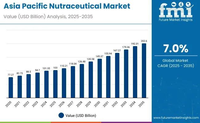 The Asia Pacific nutraceutical market is on track for strong expansion, projected to grow from USD 103.0 billion in 2025 to USD 202.6 billion by 2035, reflecting a stable CAGR of 7.0%. The region's consumers are rapidly shifting toward preventive healthcare, science-backed supplements, and clean-label nutritional products, creating an unprecedented market opportunity for manufacturers and investors.To Explore Detailed Market Data, Segment-Wise Forecasts, and Competitive Insights, Request Sample Report. https://www.futuremarketinsights.com/reports/sample/rep-ap-189
