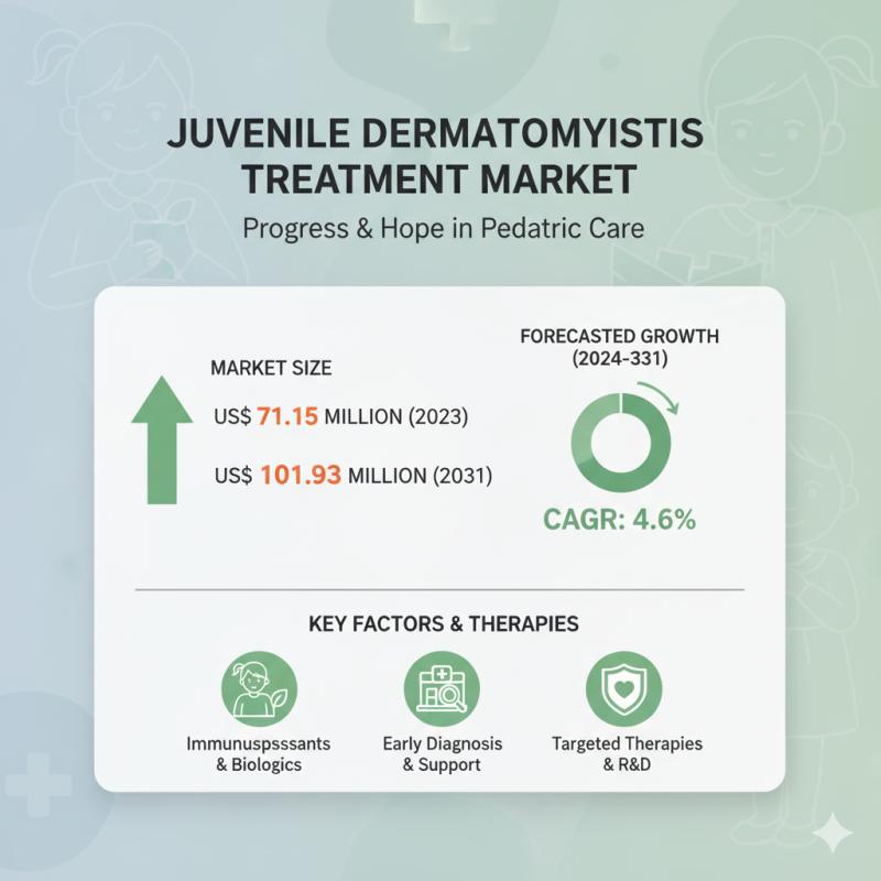 Global Juvenile Dermatomyositis Treatment Market reached US$ 71.15 million in 2023 and is expected to reach US$ 101.93 million by 2031, growing at a CAGR of 4.6% during the forecast period 2024-2031.DataM Intelligence has released its latest report on the "Juvenile Dermatomyositis Treatment Market Size 2025," providing a detailed analysis of market trends, key growth drivers, competitive landscape, and regional insights. The report includes market size (value and volume), CAGR projections, and emerging opportunities that help businesses identify growth areas and build effective strategies. Backed by data-driven insights and future outlook, this study serves as a valuable resource for companies looking to stay competitive and capitalize on market potential.