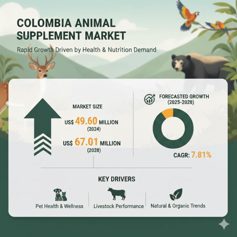 Colombia Animal Supplement Market reached US$ 49.60 million in 2024 and is expected to reach US$ 67.01 million by 2028, growing with a CAGR of 7.81% during the forecast period 2025-2028.