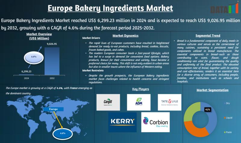 Market Size and Forecast:Europe Bakery Ingredients Market reached US$6,299.23 million in 2024 and is expected to reach US$9,026.95 million by 2032, growing with a CAGR of 4.6% during the forecast period 2025-2032, according to DataM Intelligence report.